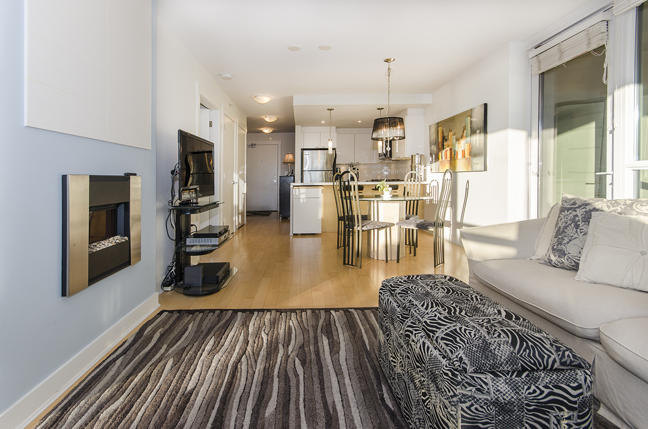 Radiant in floor heating, engineered wood floor, quartz counters etc. The ideal open plan layout is enhanced by an extra wall of windows in the living room making this an especially bright and airy suite. Plus you can walk out from both sides of your living room onto your very private, large patio space overlooking the rooftop garden!