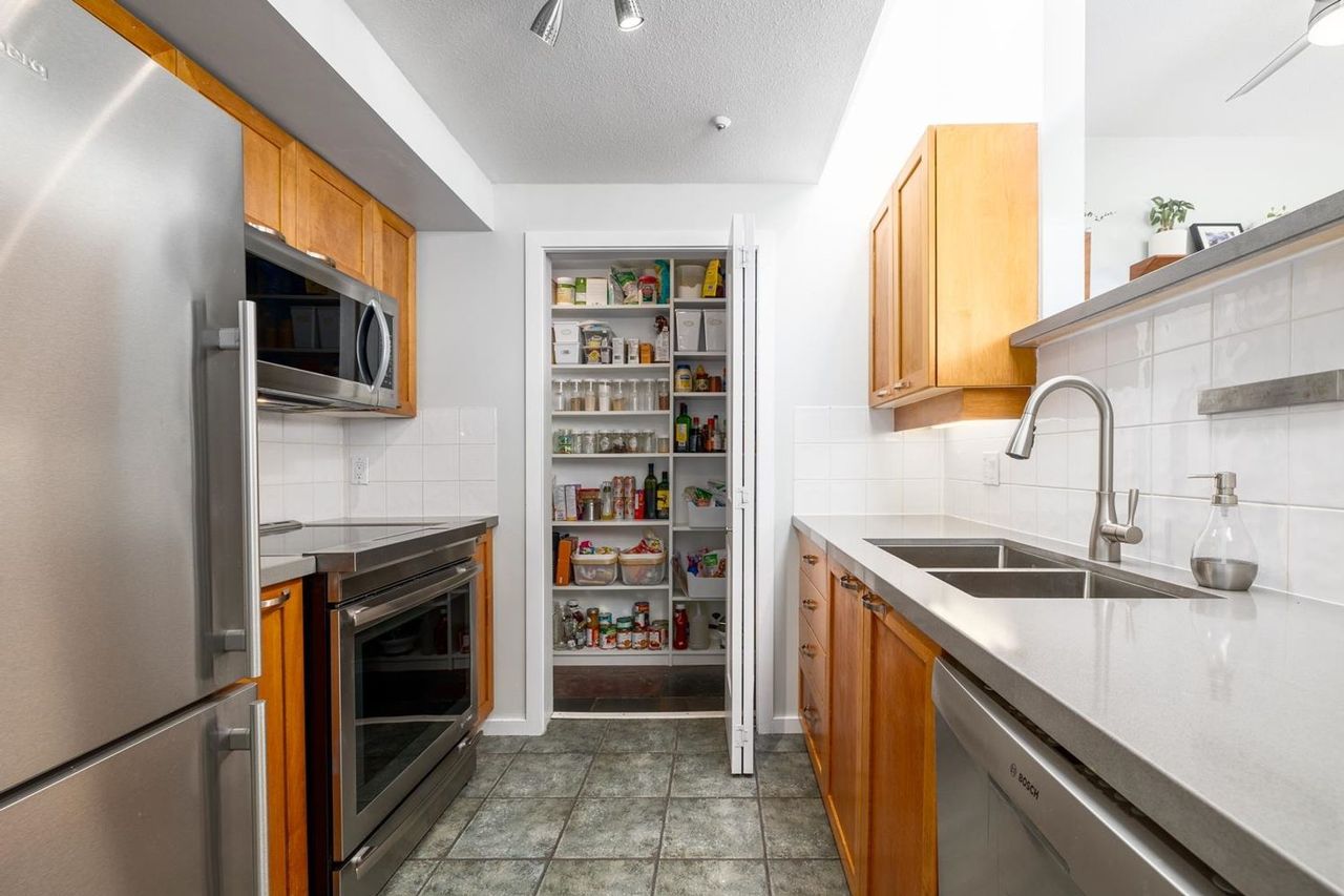 Wood floors and cabinetry, updated stainless appliances including an induction stove, new Silestone counters, new doors, a walk in pantry, and completely renovated bathroom including dual shower heads. Big windows, a long bright skylight, and tons of air flow.